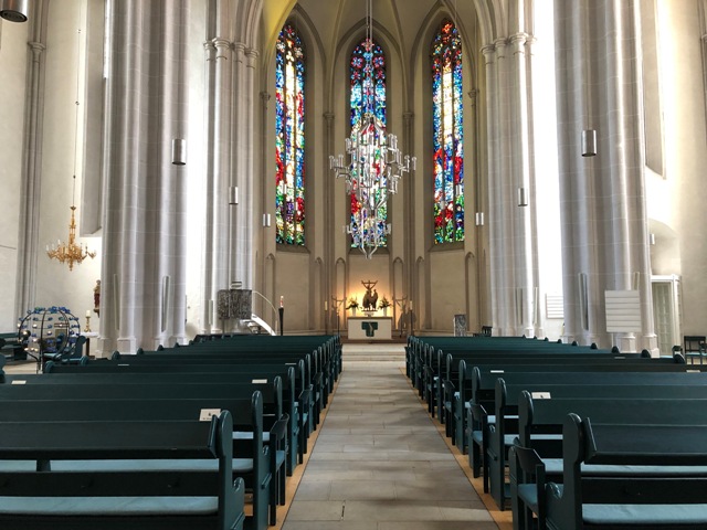 Dann begebe ich mich ganz schnell zum Haupteingang der Kirche und stelle mich so hin, als ob ich durch ihn diese Kirche betreten hätte. Denn nur so kann ich den Raum erfassen, so, wie ihn diejenigen gemeint haben, die diesen Raum erträumt, geplant, gebaut, dekoriert, ausgestattet, über die Jahre und Jahrhunderte verändert haben. Oft ist da ein Mittelgang, der direkt zum Altar führt, mein Blick wandert hinauf zum Kreuz, zu den Fenstern, mal schlicht, mal bunt, mal scheint die Sonne hindurch und hüllt alles in ein warmes Licht. Mich fasziniert dieser erste Blick jedes Mal.