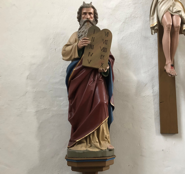 Die Hörner - sie machen Mose zusammen mit den Gesetzestafeln ohne jeden Zweifel erkennbar - und der Künstler der Mosedarstellung in St. Katharinen konnte auch im 19. Jahrhundert noch unter Beweis stellen, dass er mit der christlichen Kunstgeschichte vertraut war.