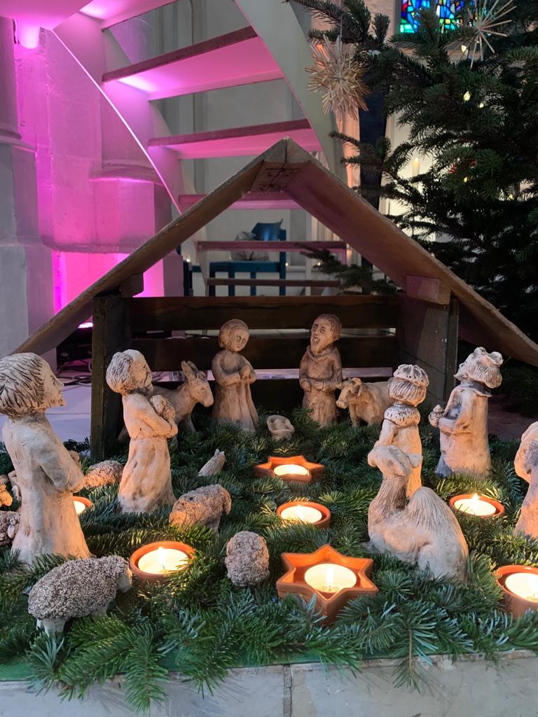 Und so verbanden wir beide Anliegen. Dank vieler Menschen, die uns unterstützen, konnten wir acht Krippenzeiten feiern. Kurze Gottesdienste, in denen die Weihnachtsbotschaft als Hoffnungsbotschaft auch in Zeiten der Unsicherheit im Vordergrund stand. Mit festlicher Musik unter der Leitung von Fabio Schnug und Holger Dolkemeyer. Und einer wunderbar beleuchteten Kirche. Vielen Dank dafür an Fritjhof Kuhlmann. 30 Tannenbäume schmückten den Raum und gaben der Kirche dadurch eine ganz besondere Atmosphäre. Am Ende gab es für alle ein Geschenk – für das Weiterfeiern der Gottesdienste zu Hause.